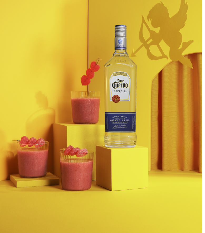 Mezcla en la licuadora el hielo, puré de fresa, tequila José Cuervo Especial Blanco, limón y el licor de naranja. Pruébalo y vierte el jarabe de agave a tu gusto.